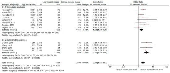 Meta-analysis of 12 studies, including a total of 2100 patients, showed that preoperative low muscle mass (all definitions) as assessed based on CT scans was significantly associated with higher odds of all postoperative complications combined (OR: 2.09, 95% CI: 1.55–2.83, Figure 3) [12,13,23,24,25,26,27,28,29,30,31,32]. The corresponding 95% prediction interval was 0.91–4.67. In this overall analysis, substantial heterogeneity was presented, reflected by an I squared of 53% [36]. Within the results of the univariable and multivariable analyses subgroups, the heterogeneity was smaller (34% and 0%, respectively, Figure 3).