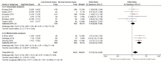 Forest plots of univariable and multivariable odds ratios for postoperative complications for gastric cancer patients with low muscle mass versus normal muscle mass.