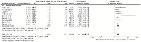 Meta-analysis of nine studies including a total of 2421 patients with a follow-up ranging from 30 months to 64 months demonstrated that low muscle mass was significantly associated with an 81% increased mortality (HR: 1.81, 95% CI: 1.52–2.14) [24,25,26,28,31,32,33,34,35]. The corresponding 95% prediction interval was 1.52–1.94. Additional calculations showed an I squared test of 32% [36] (Figure 5). All effect sizes included in this meta-analysis were obtained by multivariable analyses.