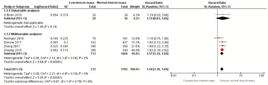 Regarding disease-specific mortality, a meta-analysis of one univariable analysis and four multivariable analyses including 1702 patients showed that low muscle mass was also significantly related to an increase of 53% in disease-specific mortality (HR: 1.58, 95% CI: 1.36–1.84) [27,28,31,34,35] with a corresponding 95% prediction interval of 1.36–1.84. Additional calculations showed an I squared test of 0% [36] (Figure 6). Subgroup analyses for studies that performed univariable and multivariable analyses are also depicted in Figure 6.