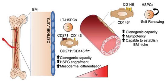 Schematic representation of a model describing mesenchymal stromal cells (MSCs) in the human bone marrow (BM) niche. In the human BM niche, different subtypes of MSCs interact with hematopoietic stem cells (HSCs) in the different perivascular regions and show specific functional characteristics. In particular, classification determinants (CD) 271 and CD271+/CD146-/low MSCs are bone-lining MSCs associated with long-term (LT)-HSCs in low oxygen areas, whereas CD146+ and CD271+/CD146+ are located around the BM sinusoids in association with activated and fast-proliferating HSCs. Abbreviations: BM—bone marrow; MSC—mesenchymal stromal cells; HSC—hematopoietic stem cell; CD—classification determinant; LT—long-term; HSPC—hematopoietic stem and progenitor cell.