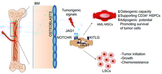 In recent years an active role of the BM niche is emerging in the pathogenesis of human hematological malignancies. In particular, alterations in the mesenchymal compartment have been described to support the expansion and survival of leukemic stem cells (LSCs). The abnormal activity of MSCs is mainly caused by tumorigenic signals, which render the BM stroma immunologically tolerant to tumor growth and instruct MSCs to sustain LSCs at the expense of normal hematopoiesis. Several studies observed a reduced proliferative capacity of MSCs isolated from BM samples of patients affected by different hematological malignancies. In particular, it has been reported that MSCs derived from acute myeloid leukemia (AML) patients have a reduced capacity to form CFU-Fs, with a failure of 25% in MSCs isolation, and a lower population doubling compared to healthy controls [96]. AML-MSCs display an abnormal adipogenic potential [97], together with impaired osteogenic capacity and a diminished capacity to support CD34+ HSPCs [98]. In line with these observations, a genome-wide analysis of AML-MSCs confirmed reduced expression of hematopoietic supportive genes, including KIT ligand (KITLG), thrombopoietin (THPO), and angiopoietin (ANGPT1), associated with a reduced proliferation capacity and a perivascular signature of leukemic MSCs [99]. This defect was associated with an altered methylation profile of AML-MSCs, which impaired the expression of several genes fundamental in the BM niche. For instance, reduced expression of KITLG and overexpression of jagged canonical Notch ligand 1 (JAG1) in AML-MSCs was reported to favor BM niche support to LSCs. In particular, NOTCH/JAG1 signaling resulted in playing a fundamental role in MSC-dependent control of tumor initiation, growth, and chemoresistance. JAG1 overexpression has been shown to induce AML in mice [100], whereas NOTCH1, JAG1, and the main Notch target gene HES1 are overexpressed in AML-MSCs thus promoting survival of tumor cells exposed to chemotherapeutic agents [101] (Figure 2). Several studies have demonstrated that the tumor BM milieu is sufficient to convert a healthy BM stroma into a tumor supporting microenvironment. For example, the exposure of healthy donor MSCs to AML-MSC conditioned medium is sufficient to decrease MSC proliferation and osteogenic differentiation [98]. Other studies reported an increased immunosuppressive/anti-inflammatory potential in AML-MSCs compared to controls. In particular, IL-10 secretion by AML-MSCs resulted in correlating directly with overall patient survival [102,103].