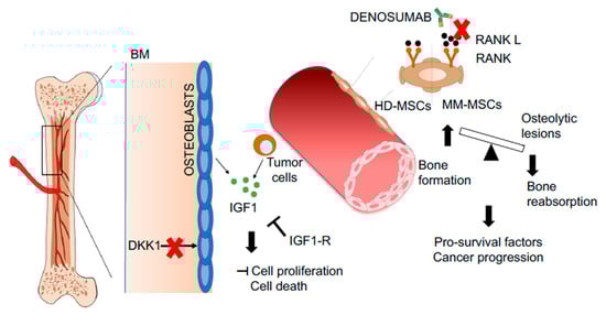 Considering the emerging active role of the BM microenvironment in the pathogenesis of hematological malignancies, the possibility to target the BM niche to contribute to the eradication of the disease has been evaluated in several clinical trials as an adjuvant treatment (Figure 3). One of the best representative cases is the use of Denosumab, a monoclonal antibody inhibiting receptor activator of nuclear factor-kappa-Β ligand (RANKL) in multiple myeloma (MM) patients. RANKL expression is increased in MSCs of patients affected by MM, altering the normal balance of bone formation/reabsorption that is the cause of osteolytic lesions, bone pain, and related pathological fractures [129,130]. Several clinical trials demonstrated that Denosumab is capable of ameliorating bone disease in MM [131,132] and was associated with prolonged survival of treated patients, confirming an active role of BM stroma in the progression of the pathology [133]. The use of Dickkopf-related protein 1 (DKK-1) antagonist has been studied for their ability to restore osteoprogenitor function and prevent osteolytic bone lesions [134]. DKK1- plays an important role in MM-induced osteolysis by inhibiting osteoblast differentiation [135]. Besides, a key role of IGF1 in skeletal lesions formation has been described in MM patients [136]. The administration of small insulin growth factor-1 receptor (IGF-1R) inhibitors blocks the interaction of IGF1 released by BM stroma and tumor cells, causing a dose-dependent inhibition of cell proliferation and induction of cell death (Figure 3). Importantly, the altered balance of bone formation/bone resorption is not only the cause of bone lesions but also induces the release of proliferation/pro-survival factors from the BM stroma, which favor malignant cells at the dispense of HSPCs, favoring cancer progression [137]. For instance, the release of tumor necrosis factor-α (TNF-α) induces a change in the adhesion molecule profile of MM cells, which become more adherent to the BM niche displacing normal HSPCs [138]. This mechanism guarantees a higher level of protection from differentiation signaling and chemotherapeutic agents [139,140]. In this view, the VLA4-CD44 axes have been shown to increase the adhesion of cancer cells to MSCs and facilitate drug efflux [141]. Similarly, overexpression of N-cadherin mediates the adhesion of malignant cells to MSCs by increasing the number of N-cadherin-β-catenin complexes that promote the activation of Wnt signaling, mediating the resistance against tyrosine kinase [142]. An active form of TGF-β is released upon bone remodeling, increasing the production of IL-6 in MSCs and tumor cells, which plays an essential role in promoting cancer progression [143,144]. The upregulation of C-X-C chemokine receptor type 4 (CXCR4) is another strategy adopted by cancer cells to find protection within the BM niche. Indeed, CXCR4-CXCL12 interaction is one of the best-studied players in the cross-talk between cancer cells and BM-MSCs. CXCR4 has been shown to be overexpressed in several types of hematological malignancies, conferring an increased capacity of LSCs to seed in the BM niche where the microenvironmental conditions are more conducive to cell proliferation and viability [145,146,147].