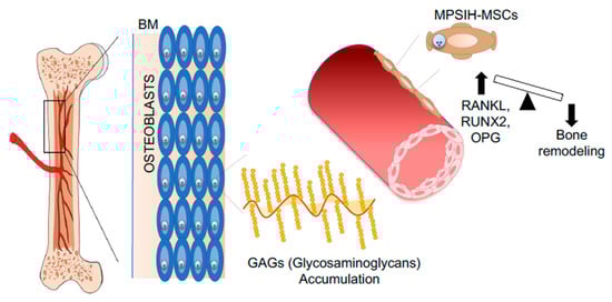 Representative pictures of pathological BM niches in MPSIH patients. MSCs derived from mucopolysaccharidosis type I- Hurler–syndrome (MPSIH) patients. The accumulation of Glycosaminoglycans (GAGs) causes multiorgan dysfunction, including bone defects. The upregulation of RANKL/RANK/OPG pathway causes unbalanced bone remodeling. Abbreviations: BM—bone marrow; MPSIH-MSCs—Mucopolysaccharidosis type I Hurler–derived mesenchymal stroma cells; RANK—receptor activator of nuclear factor-kappa-Β ligand; RANKL—RANK ligand; OPG—osteoprotegerin.