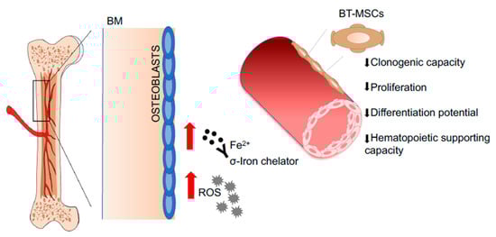 Representative pictures of pathological BM niches in BT patients. MSCs derived from Beta Thalassemia (BT) patients. Iron accumulation in the BM leads to increased levels of Radical Oxygen Species (ROS), which causes a pauperization of the primitive MSC pool and alters the MSC hematopoietic supportive function. Abbreviations: BM—bone marrow; BT-MSCs—beta-thalassemia derived mesenchymal stroma cells; Fe2+—iron, ferrous ion.