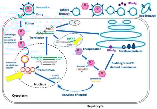 This figure represents the viral cycle of HBV from the entrance of the virus in the hepatocyte to the synthesis of new virions.