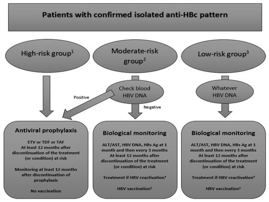 With the recent data, we also think that patient management is mainly driven by the HBV DNA level in the blood. In patients with detectable HBV DNA (i.e., OBI), a preemptive treatment has to be introduced with the same rules about duration and monitoring as in the high-risk group. HBV vaccination could be of interest in patients with detectable HBV DNA but has not been clearly defined yet.