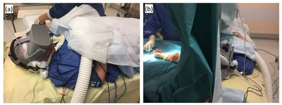 (a) Virtual reality helmet set up after installation in the operating room; (b) intraoperative virtual reality session.
