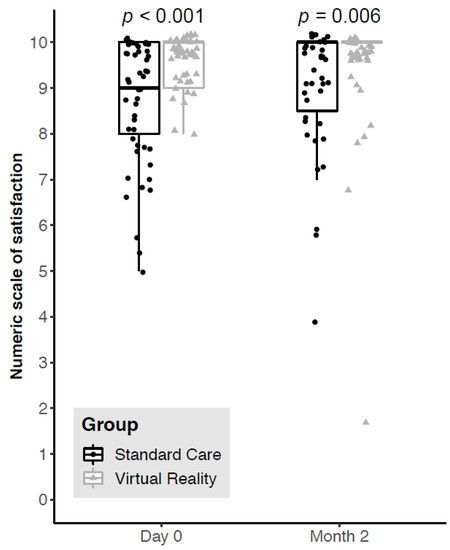 Eighty-four percent (84%) of patients could be contacted by telephone two months after the surgical procedure: 41 in the Standard Care group and 43 in the VR group. The benefit persisted over time, with significantly higher satisfaction scores at two months in patients who had virtual reality (median satisfaction score = 10[Interquartile 10; 10] vs. 10[8.5; 10], p = 0.006, Figure 2). There was no significant change in the reported satisfaction scores between D0 and M2 within each group.