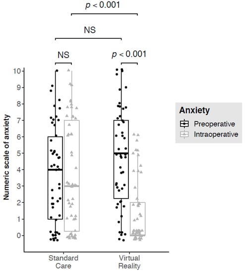 Boxplot graphical representation of perioperative (pre—in dark-grey plots and intraoperative—in light-grey triangles) anxiety scores of patients operated before (Standard Care group) and after (Virtual Reality group) virtual reality became available in the department. The upper edge of the box represents the 75th percentile and the lower edge represents the 25th percentile. The vertical length of the box represents the interquartile interval and the central horizontal line represents the median. The upper moustache extends from the upper edge to the highest value at 1.5 times the interquartile space. The lower moustache extends from the lower edge to the lowest value at 1.5 times the interquartile space. Each dot or triangle represents a patient. Some jittering was added to prevent the overplotting of dots.