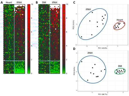 Metabolic profiling of plasma of pulmonary arterial hypertension (PAH) patients (n = 11), and comparison with diabetes mellitus (DM; n = 12) and left heart disease (heart; n = 11) patients. Our data indicate significantly (p < 0.05) altered metabolites in PAH vs. heart and PAH vs. DM analysis. (A,B) Heat maps and (C,D) principal component analysis (PCA) show the clustering of the PAH group that could differentiate PAH patients from DM and heart by circulating metabolites. Ellipses indicate the area of a 0.95 probability that the metabolic profiling of the patient from the same group will be inside an ellipse.