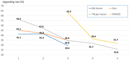 Illustrations of the upgrading rates after targeted biopsies (TB) (in %; on the vertical axis) according to different pre-biopsy parameters: PIRADS (Prostate Imaging-Reporting and Data System) score (yellow line; 3 vs. 4 vs. 5 on the horizontal axis), MRI (magnetic resonance imaging) lesion size (orange line; 1: <10 mm; 2: 10–15 mm; 3: ≥15 mm on the horizontal axis), TB core number (grey line; 1 vs. 2 vs. 3 vs. 4 vs. ≥5 on the horizontal axis), and number of MRI lesions (blue line; 1 vs. 2 vs. ≥3 on the horizontal axis).
