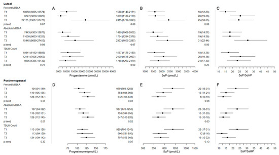 Graphical representation of major findings/patterns of association between progesterone, 5α-pregnanes (5αP), and 5αP/3α-dihydroprogesterone (3αHP) with mammographic breast density (MBD) and terminal duct lobular unit (TDLU) measures among luteal phase premenopausal women (panels A: progesterone, B: 5αP, and C: 5αP/3αHP) and postmenopausal women (panels D: progesterone, E: 5αP, and F: 5αP/3αHP). The box represents the geometric mean (GM), and whiskers represent the 95% confidence interval (CI) across tertile of percent MBD-A, absolute MBD-A, and TDLU count (from top to bottom in each panel). In panels A and D, progesterone tended to be positively associated with MBD measures in both the luteal phase (panel A) and postmenopausal (panel D) women. In contrast, patterns for 5αP and 5αP/3αHP were opposite in luteal phase (panels B and C) and postmenopausal (panels E and F) women, with positive patterns of association among luteal phase women and inverse patterns of association in postmenopausal women.