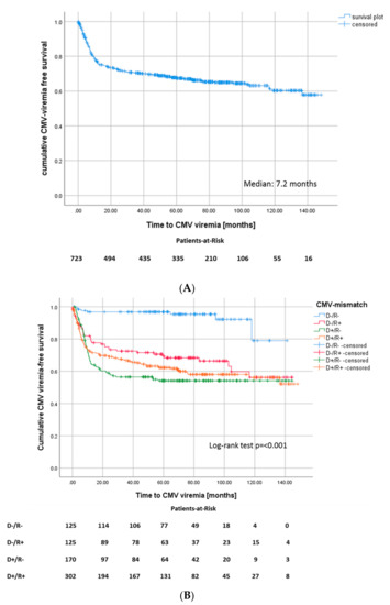 (A) Kaplan–Meier survival plot for onset of CMV viremia after transplantation, (Median: 7.2 months) and (B) for onset of CMV viremia after transplantation according to CMV match.