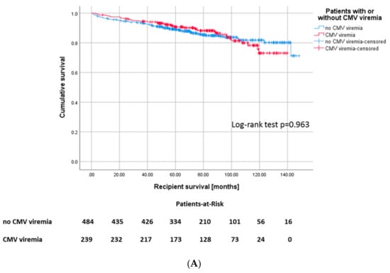 The overall survival of recipients in the CMV+ cohort was not different from the CMV− cohort (p = 0.963, Figure 2A). Likewise, the overall graft survival did not differ between CMV+ and CMV− patients (Figure S1).