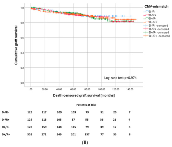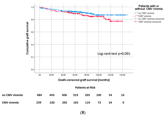 However, the incidence of terminal graft failure was not different between the groups, although there was a tendency towards a longer graft survival in the CMV− cohort (135 ± 1.8 months versus 122 ± 2.7 months, p = 0.091, Figure 2B).