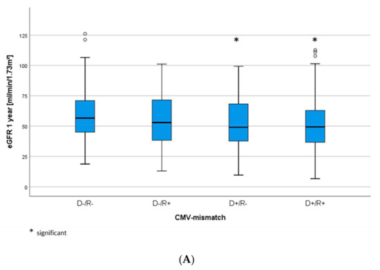 Patients who developed CMV infection showed a noticeably lower estimated glomerular filtration rate (eGFR) after one year (48.8 versus 55.2 mL/min/1.73 m2, p = 0.000), after three (50.2 versus 54.6 mL/min/1.73 m2, p = 0.008), and five years (47.5 versus 53.2 mL/min/1.73 m2, p = 0.002), respectively (Table 2).