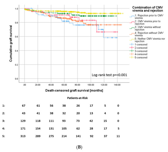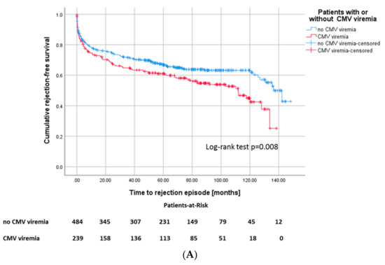 (A) Kaplan–Meier survival plots for the incidence of rejection episodes, p = 0.008 according to CMV viremia, and (B) for death-censored graft survival according to the different constellations of onset of CMV viremia and rejection episodes, p ≤ 0.001.