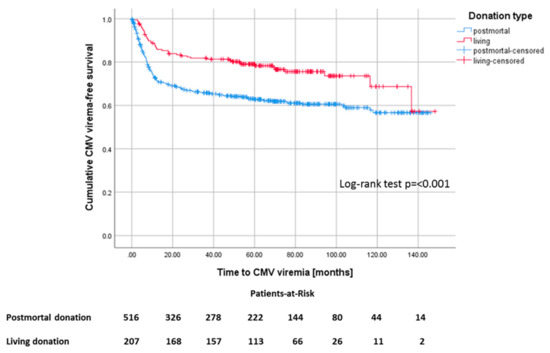 Kaplan–Meier survival plot for the development of CMV viremia, p ≤ 0.001, according to living versus postmortal donation.