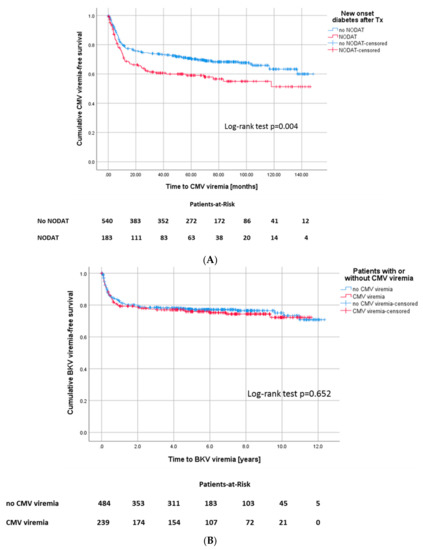 (A) Kaplan–Meier survival plot for onset of CMV viremia, according to development of NODAT, Log-rank test: p = 0.004 and (B) for onset of BKV viremia, Log-rank: p = 0.652, according to development of CMV infection.