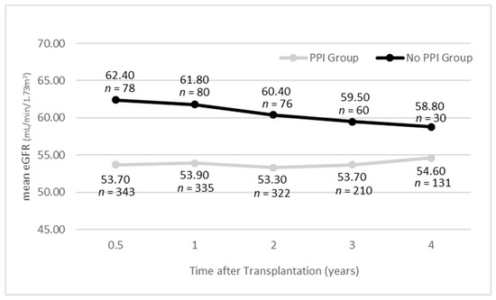 The PPI group showed significantly lower eGFR compared to the no PPI group at half a year, one year and two years pTx (p < 0.05) (multivariable). For the third and fourth year, the difference was not statistically significant (Supplementary Materials 3). The trend in the mean eGFR can be seen in Figure 1.