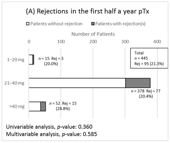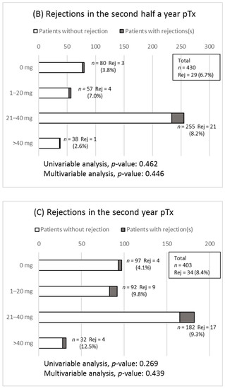 Results of the biopsy proven rejection analyses are shown. Grouping is according to PPI intake (pantoprazole equivalent) in the relevant time period. Rejection prevalence is shown as absolute number and as percentage of patients in the group. The dark part of each bar represents the number of patients with rejections. Abbreviations: n, total number of patients in the group; Rej, number of patients who experienced a graft rejection; pTx, post transplantation. (A) Analysis of rejections in months 1–6 pTx. (B) Analysis of rejections in months 7–12 pTx. (C) Analysis of rejections months 13–24 pTx.