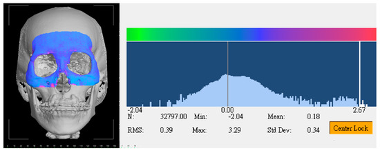 The image data were stored in Digital Imaging and Communications in Medicine (DICOM) format and processed with a slice thickness of 0.4 mm. The 3D bone and soft tissue facial models were processed and analyzed using the SimPlant O and O software (Materialize Dental, Leuven, Belgium). To assess the preoperative and postoperative maxillary bone and midface soft tissue structures, the postoperative 3D model was superimposed on the corresponding preoperative 3D model at the skull base, forehead, and orbital areas (non-operated parts) by using the best-fit method [26,33]. Accuracy of superimposition was checked by the root-mean-square deviation tool (3dMD Vultus software, 3dMD LLC, Atlanta, GA, USA), with a value of ≤0.5 mm certifying precision [26,30,33,34] (Figure 2). Both the facial bone and the soft-tissue components were concomitantly addressed by alternating the type of imaging modality and 3D models in the SimPlant software.