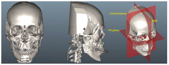 Three-dimensional skeletofacial model displaying the anatomical landmarks and reference planes, including the horizontal plane (X axis; Frankfort horizontal plane, FH), the sagittal plane (Y axis; midsagittal plane, MSP), and the coronal plane (Z axis). For definitions, please refer to Table 2.