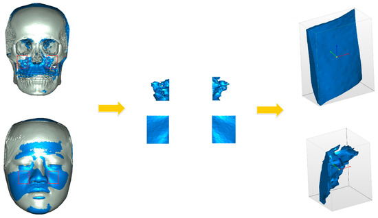 To evaluate the soft tissue changes associated with the underlying bone movements, the anteromedial cheek volumetric change caused by the orthognathic surgery was measured. The region of interest was selected based on previous findings that movement within each region was uniform [26]. These were defined by the intersection of four reference planes to represent the bilateral anteromedial cheek regions (Figure 4). By adopting the superimposed preoperative and postoperative 3D facial models, the bone and soft tissue volumetric change (mm3) models were automatically created by using the subtraction tool: postoperative minus preoperative models (Figure 5).