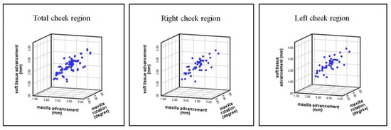 Overall, the scatter plots and multiple linear regression analyses demonstrated that the anteromedial cheek soft tissue sagittal movement can be accurately predicted based on the type of maxillary bone movement. The appraisal of the scatter plots displayed extremely strong (all r > 0.8) positive linear relationships between anteromedial cheek soft tissue sagittal movement and maxillary bone advancement and rotational movements. The results revealed high multiple correlation coefficients of determination (R2 values between 0.788 and 0.789), indicating that the dependent variable (cheek soft tissue movement) had a significant direct dependence on the variation of the independent variables (maxillary bone advancement and rotational movements). In total, 78.9%, 78.8%, and 78.8% of the variations in the anteromedial cheek soft tissue movement were explained by the variation in the maxillary advancement and rotational movements for the right, left, and total cheek regions, respectively. Moreover, all of the multiple linear regression models could be used to predict the cheek soft tissue movement from the corresponding bone movements, there existing a larger effect of the maxillary advancement on the cheek soft tissue sagittal movement than the maxillary rotational movement. For example, in the total cheek region, a cheek soft tissue advancement of 0.627 mm could be expected with a maxillary advancement of 1 mm, and a cheek soft tissue advancement of 0.070 mm could be expected with a maxillary rotation of 1 degree.