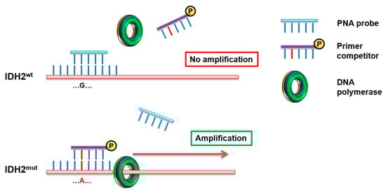 The method described forecasts an overlay between the sequences of PNA probes and the competitor primers IDH2 forward and IDH2 R172K reverse (Table 1) respectively for the detection of R140Q and R172K mutations, thus leading to a direct competition towards complementary DNA. In the case of IDHwt, a perfect matching occurs between PNA (designed on reference sequence) and DNA, so the PNA-template hybridization is favored, while DNA amplification results suppressed. Contrariwise, a non-perfect matching (as in the case of IDH2mut) promotes the hybridization between template and primer competitors, allowing a specific amplification (Figure 1).