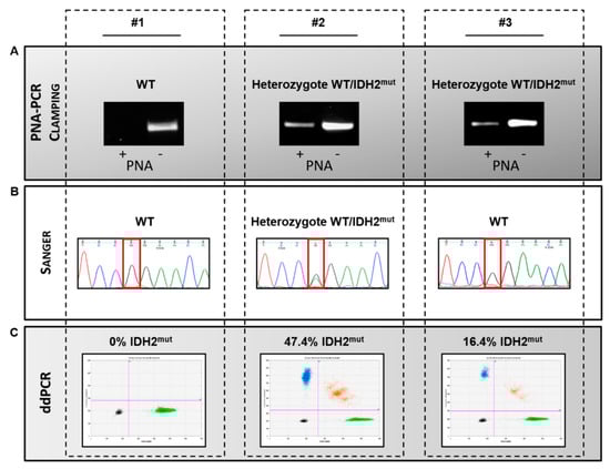 Figure 4 shows an example of three DNA from AML patients tested with the three different techniques: PNA-PCR clamping (Figure 4A), Sanger sequencing (Figure 4B) and ddPCR (Figure 4C). The example shows that all techniques correctly identified IDH2 status for patient #1 and #2, wild type and mutated in heterozygosis (47.4% of mutation quantified by ddPCR), respectively. By contrast, patient #3 resulted in IDH2 mutated by ddPCR and PNA-PCR clamping, while Sanger sequencing failed to identify the IDH2 mutation (16.4% of mutation quantified by ddPCR).