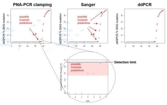 3.2. Comparison of Sanger Sequencing, PNA-PCR Clamping and ddPCR for the IDH2mut Detection