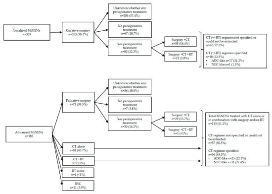 Additional data on clinical-pathological characteristics, treatment modalities, and survival outcomes of patients with a diagnosis of MiNEN are presented in Table 1, Table 2 and Table 3 and Supplementary Materials Table S1.