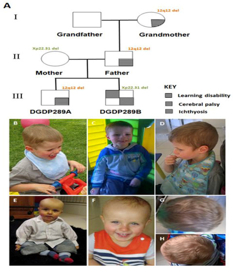 DGDP289B (Figure 1A), the younger brother by two years of DGDP289A, was admitted to the Children’s Hospital at two months of age for failure to thrive. He had ichthyosis due to the deletion of STS, but upon examination there were no apparent concerns about developmental delay. At seven months, the baby weighed 6.01 kg (<3rd percentile). His length was 65.5 cm (10–25th percentile), while his head circumference was 42.6 cm (10th percentile). He also displayed notable frontal bossing (Figure 1E,F,H). At seven months, the infant was not able to roll from front to back or sit, and had limited neck control. He had dry skin, but no lesions or breakdown of the skin. His testes were palpable bilaterally in the scrotum. The toddler did not grasp or reach for toys and often had unusual hand posturing, holding his arms in an internally rotated and extended position. He held his legs in a scissored extended posture and, when standing, did not take much weight and collapsed. However, his muscle tone in all limbs was normal, and he was not hyperreflexic. DGDP289B was also examined by a physiotherapist and a pediatrician, who noted both mild developmental and speech delays. The infant had some feeding difficulties and displayed bronchiolitis. His mother had concerns about plagiocephaly and noted early right-hand preference. Microarray at nine months revealed a microdeletion at Xp22.31 with no chromosome 12 anomaly. At age one, a videofluroscopy was performed by a speech pathologist, during which he participated cooperatively. He presented with delayed swallowing and an aspiration risk. DGDP289B walked at 32 months, and at 36 months displayed gross motor delay. According to his neurologist, his clinical features resembled cerebral palsy. His healthy mother has the same Xp22.31 microdeletion, with no 12q12 genomic deletion.