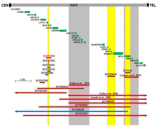 We compared the 12q12 microdeletion in our patient DGDP289A with five CNVs (DCP261503, DCP255553, DCP256710, DCP262066, DCP275780) described in the DECIPHER database [41] (Figure 2). The candidate region, encompassing three genes, SLC2A13, LRRK2, and MUC19, was narrowed down to LRRK2. In addition to the microdeletion and clinical phenotype in DGP289A, two other DECIPHER cases (DCP250361 and DCP139) and two reported cases suggest a total of four 12q12 chromosomal segments which are likely involved in the clinical features of developmental delay/intellectual disability and craniofacial anomalies (Figure 2) [13,14]. Four chromosomal segments highlighted in yellow or gray (Figure 2), each of which are likely involved in clinical features of developmental delay/intellectual disability and craniofacial anomalies, were identified. The first segment encompasses LRRK2, the second segment, a previously published microdeletion [14], includes five genes, GXYLT1, YAF2, ZCRB1, PPHLN1 and PRICKLE1, the third region (DECIPHER case DCP250361) contains deletions of PUS7L, IRAK4, TWF1 and TMEM117, and, in the fourth segment, NELL2 is deleted [13] (Figure 2).