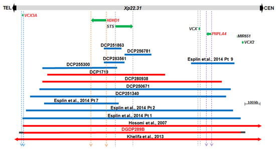 The Xp22.31 microdeletion in the proband’s brother, DGDP289B was compared to 14 CNVs including eight cases derived from the DECIPHER database [41]. The microduplication in DCP256781 involves STS only (Figure 3). Four CNVs (DCP251863, DCP283561, DCP255300, and DCP1719) encompass HDHD1 and STS only, while the microduplication in Patient 9 of Esplin et al. spans VCX and PNPLA4 only [42]. Four larger CNVs (DCP280938, DCP250671, DCP251340 and Patient 2 of Esplin et al. include HDHD1, STS, VCX and PNPLA4 only [42]. The microdeletion in Patient 1 of Esplin et al. truncates VCX3A and spans the four aforementioned genes [42]. The CNVs in patients of Hosomi et al. and Ben Khelifa et al. span at least VCX3A, HDHD1, STS, VCX, PNPLA4, VCX2 and microRNA MIR651 [19,43]. The microdeletion in DGDP289B also includes MIR651. However, due to the repetitive nature of sequences around the VCX genes, we do not know whether VCX3A and VCX2 are also included in the microdeletion in DGDP289B.