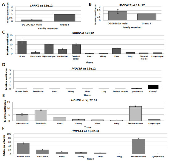 Primers targeting LRRK2 exon 2 and HDHD1 3′-UTR were used to investigate inheritance of the microdeletions at 12q12 and Xp22.31, respectively. We designed primers against the genic and non-genic regions around the boundaries of both microdeletions to determine the location of the proximal as well as the distal deletion breakpoints (Table S1). Primers from non-repetitive regions targeting PNPLA4 3′-UTR, SLC2A13 exon 2, CNTN1 exon 4, and MUC19 exon 7 were also designed for RT-qPCR. Total RNA was isolated from LCLs using the RNeasy Plus Mini kit (Qiagen, Germantown, MD, USA) following the manufacturer’s instructions. One microgram of total RNA from the whole human brain, fetal brain, hippocampus, cerebellum, cerebral cortex, heart, liver, lung, and skeletal muscle was purchased from Clontech (Mountain View, CA, USA). Details of the ages of the individuals from whom the total RNA samples originate have been described previously [7]. Synthesis of cDNA was performed using the RevertAid First cDNA Synthesis Kit (Thermo Scientific, Waltham, MA, USA). Real-Time PCR was carried out using 2 µL cDNA, 2.5 µM primer and 10 µL FastStart DNA Green Master (Roche, Indianapolis, IN, USA) in a 20 µL reaction volume. Samples were run in triplicates and standard deviations were calculated from 2–3 independent experiments. The ΔΔct method was used to determine relative quantification of copy number (qPCR) and transcripts levels (RT-qPCR) [28].