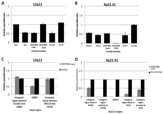 Assays by qPCR revealed that the 12q12 microdeletion in DGDP289A was inherited from his father, who in turn acquired it from his mother (the patient’s paternal grandmother) (Figure 5A). The mother and paternal grandfather of DGDP289A did not have the 12q12 microdeletion. qPCR assays also revealed that the Xp22.31 microdeletion in DGDP289B was inherited from his healthy mother (Figure 5B). Males are hemizygous for the Xp22.31 region, as seen in the copy number in the patient’s father compared to the paternal grandmother.