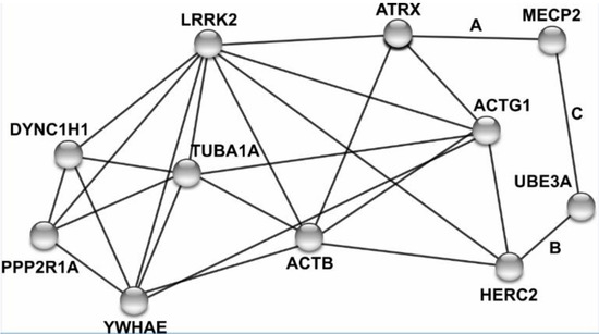 Expanding the network to include a secondary set of physical interactions revealed MECP2 and UBE3A interact themselves, and physically interacted with ATRX and HERC2, respectively [33,34,35]. Pathway analysis with the eight initial genes of interest with LRRK2 did not yield enrichment for notable biological pathways, however, it did identify a large proportion of the six interacting proteins that localize to the cytoskeleton (ACTB, ACTG1, DYNC1H1, HERC2, PPP2R1A, and TUBA1A).