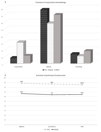 Evolution of lung function and radiology during follow-up. (a) During follow-up, FVC remained stable in 77.8% of patients, improved in 8.3% and worsened in 13.9%. During follow-up, DLCO remained stable in 58.3% of patients, worsened in 11.1%, and improved in 30.5%. HRCT was stable in 70.4% of cases, worsened in 18.2%, and improved in 11.4%. (b) Evolution of lung function. The median of FVC was 88.5%, 86.9% and 85.45% at baseline, after one year and at the end of follow-up, respectively. The median of DLCO was 66.4%, 64% and 64.5% at baseline, after one year and at the end of follow-up, respectively. FVC: forced vital capacity; DLCO: diffusing capacity of the lung for carbon monoxide; HRCT: high resolution computed tomography.