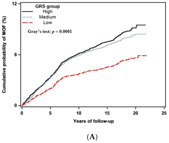 Crude (unadjusted) 10-year cumulative incidence of major osteoporotic (A) and hip fracture (B) stratified by the GRS group, including competing mortality risk. The difference in the cumulative incidence rates among different GRS groups was tested by using Gray’s test, with p-value <0.01 indicating a significant difference between the groups.
