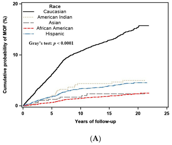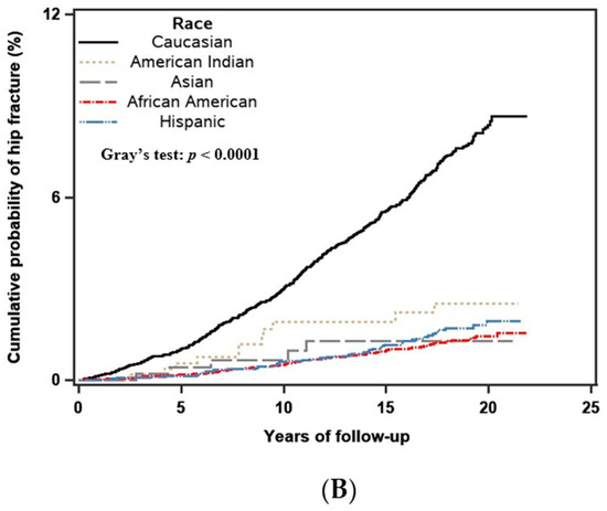 Crude (unadjusted) 10-year cumulative incidence of major osteoporotic (A) and hip fracture (B) stratified by race, including competing mortality risk. The difference in the cumulative incidence rates among different racial groups was tested by using Gray’s test, with p-value <0.01 indicating a significant difference between the groups.