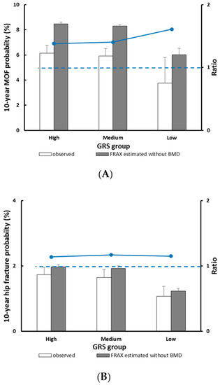 Observed versus predicted 10-year major osteoporotic fracture (A) and hip fracture (B) probability stratified by the GRS group. The dotted line indicates a relative ratio of 1 (reference line); ratio >1 indicates that FRAX overestimates fracture probability.