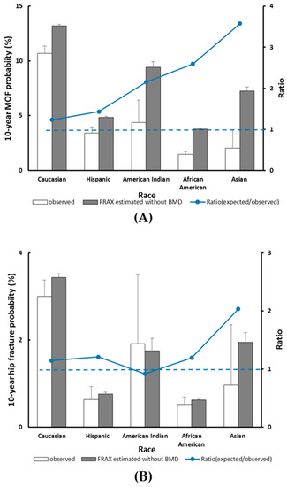 Observed versus predicted 10-year major osteoporotic fracture (A) and hip fracture (B) probability stratified by race. The dotted line indicates a relative ratio of 1 (reference line); ratio >1 indicates that FRAX overestimates fracture probability.