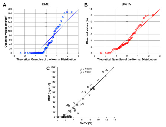 Distribution of BMD and BV/TV in the study population. Quantile-quantile plots of the bone mineral density (BMD) (A) and bone volume/tissue volume (BV/TV) (B) values obtained for the 57 cusps analysed by micro-computed tomography (μCT). (C) Correlation between BMD and BV/TV values. Statistical significance (p-value) of the correlation and Spearman’s coefficient (ρ) are shown.