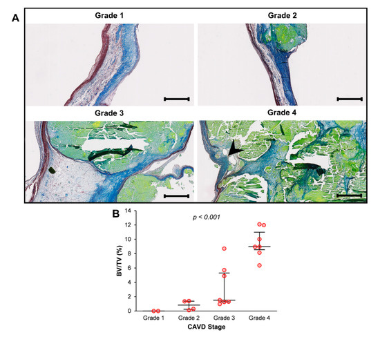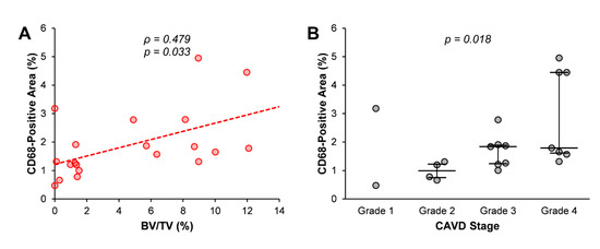 Relationship between macrophage infiltration and aortic valve calcification progression. (A) Correlation between CD68-positive area and bone volume/tissue volume (BV/TV) values. Spearman’s correlation coefficient (ρ) and statistical significance (p-value) are shown. (B) CD68-positive area in each stage of calcific aortic valve disease (CAVD) according to Warren and Yong’s score. p-value for trend (Jonckheere-Terpstra’s test) is shown. Median and interquartile range are represented.