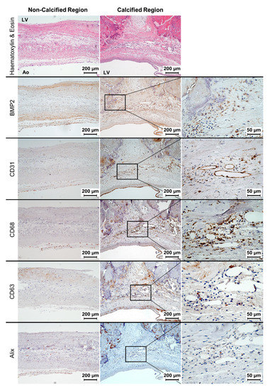 Representative images of immunohistochemistries for BMP2, CD31, CD68, CD63 and Alix on both calcified and non-calcified regions of aortic valve cusps. Images of a haematoxylin and eosin stain are shown to facilitate recognition of calcium deposits as acellular and eosinophilic areas with an amorphous extracellular matrix. LV = left ventricular side; Ao = aortic side.