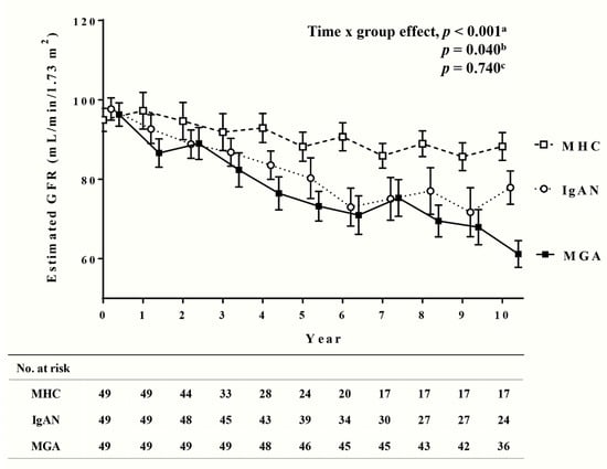 In the retrospective study to evaluate long-term kidney function, we analyzed within-group differences in eGFR over time, and the mean annual rate of eGFR decline between the MHC, MGA, and IgAN groups. The date of kidney biopsy was defined as the start of the follow-up period (baseline).