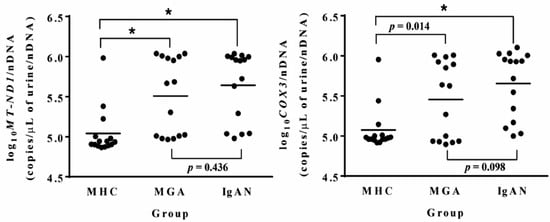 Urinary mitochondrial DNA copy numbers in the matched healthy control (MHC), minor glomerular abnormality (MGA), and immunoglobulin A nephropathy (IgAN) groups. Data were analyzed by the Mann–Whitney test. * p < 0.001. MT-ND1, mitochondrially encoded NADH dehydrogenase 1; COX3, cytochrome c oxidase subunit III.